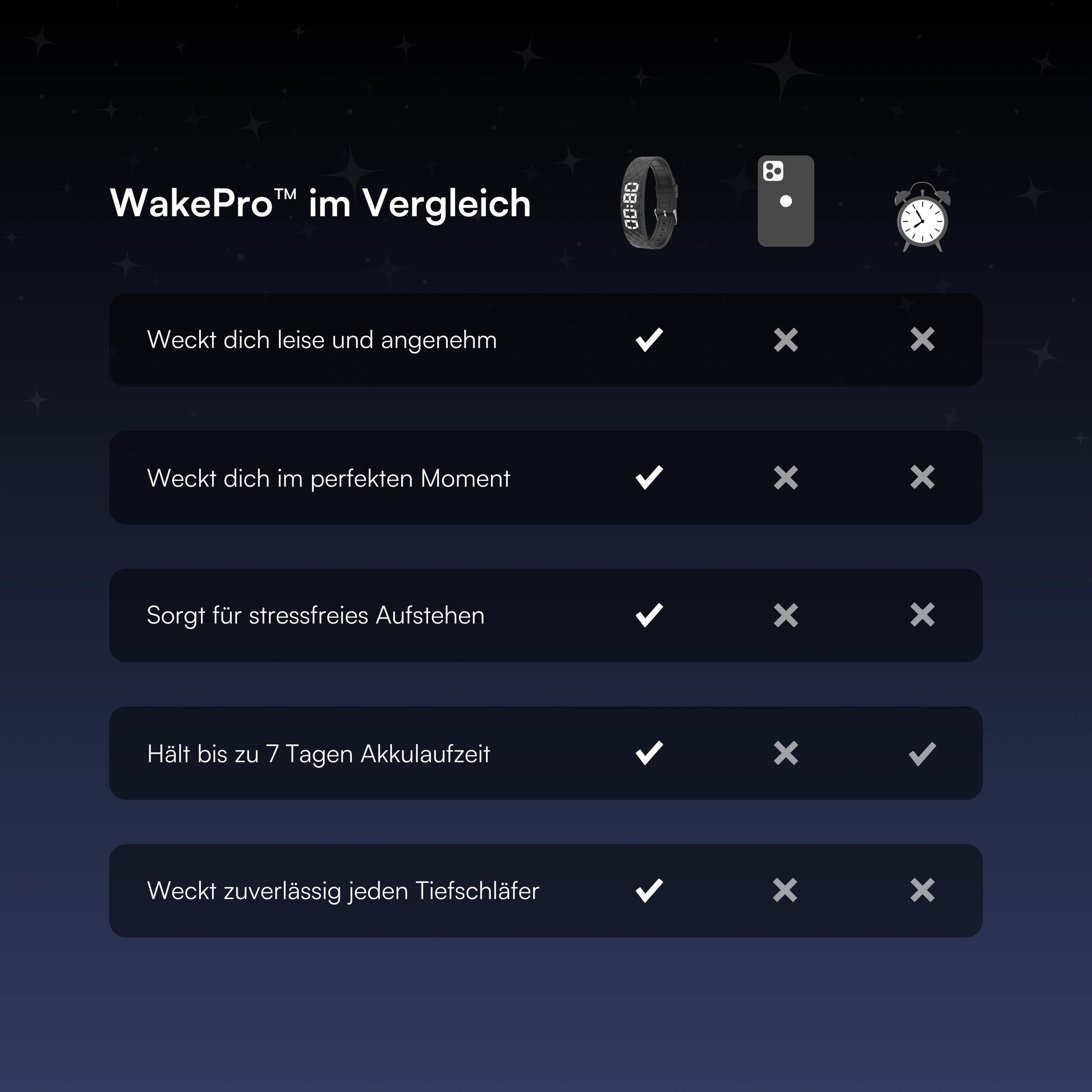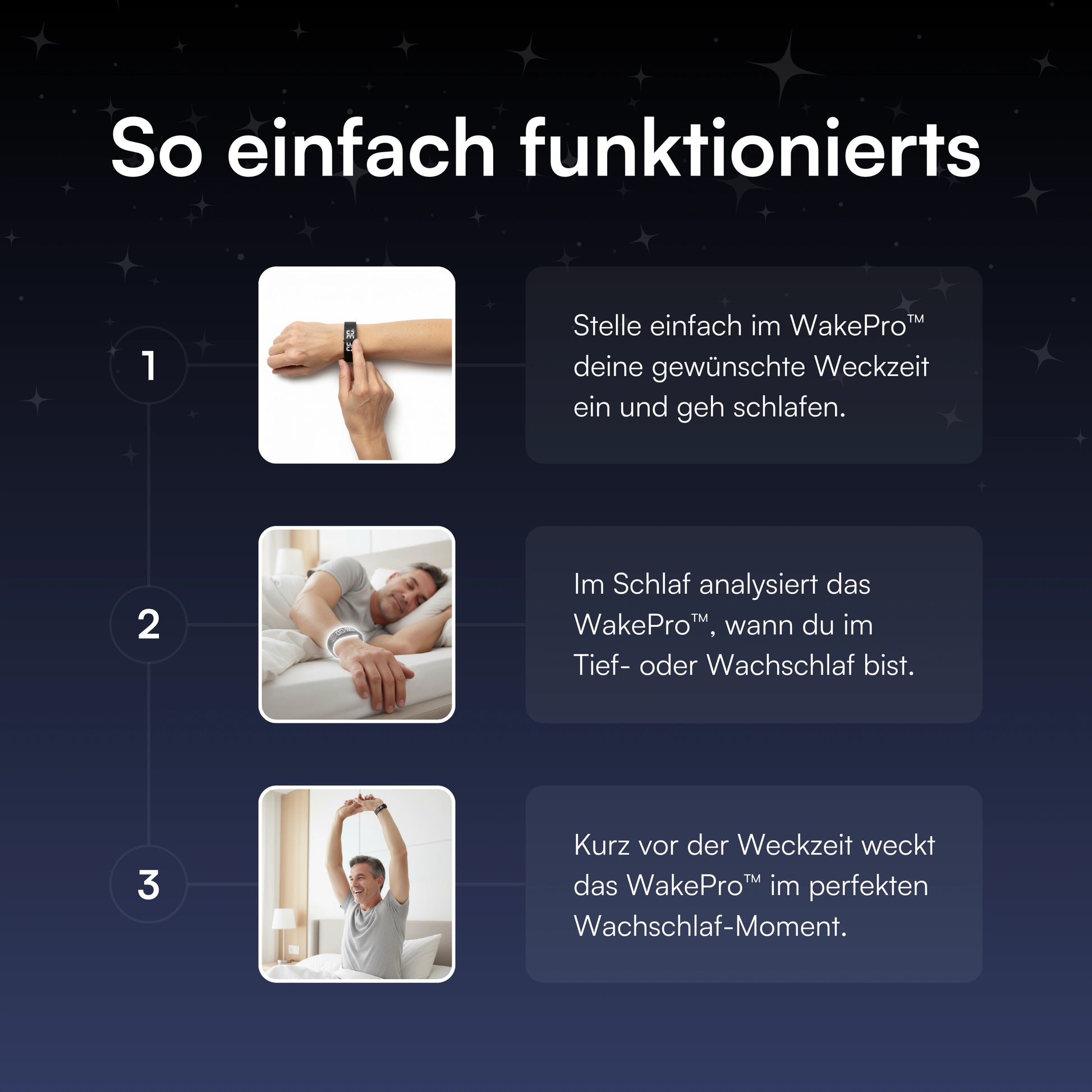 Starte im richtigen Moment durch sanftes Vibrieren in den Tag. Ob kurze Nächte oder unterschiedlicher Rhythmus der WakePro™ weiß genau, wann er dich wecken soll.