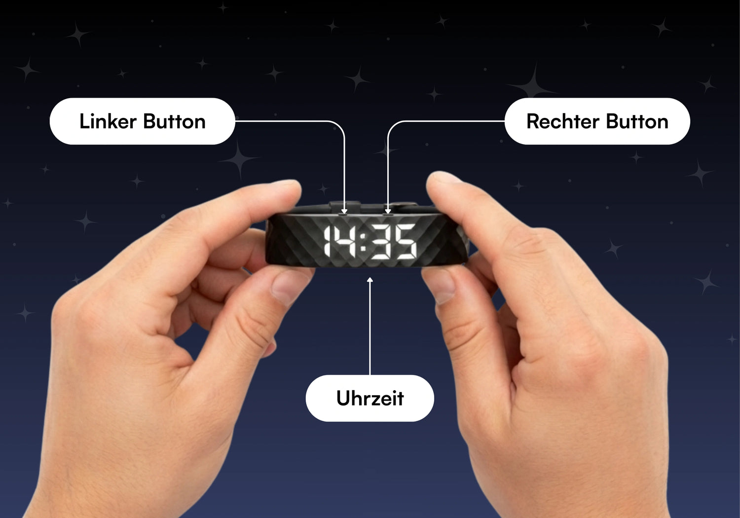 Nutze den linken und rechten Button, um durch das Menü zu navigieren. Sobald die Zeit angezeigt wird, stelle durch langes Drücken des rechten Buttons deine Ortszeit ein.